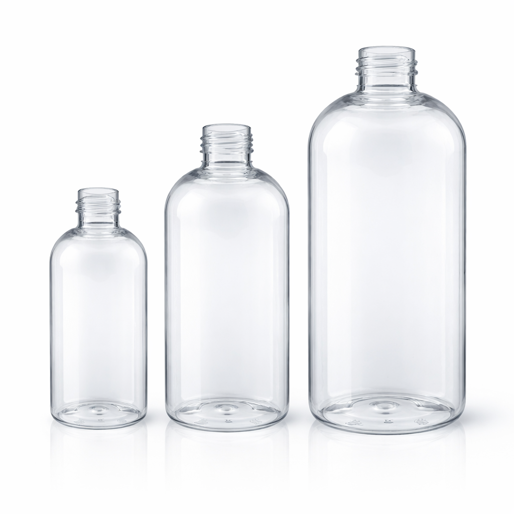 Clear Boston Round Bottles offer a clean, professional packaging solution ideal for skincare, haircare, and personal care products. These versatile bottles feature the classic Boston round design with rounded shoulders and a narrow neck, making them perfect for lotions, serums, oils, toners, shampoos, and liquid formulations. Made from durable, clear plastic, they allow easy product visibility while maintaining a sleek, minimal presentation. Available in multiple sizes, they are compatible with a variety of caps, pumps, and sprayers, making them ideal for private label products, cosmetic packaging, and professional formulations.